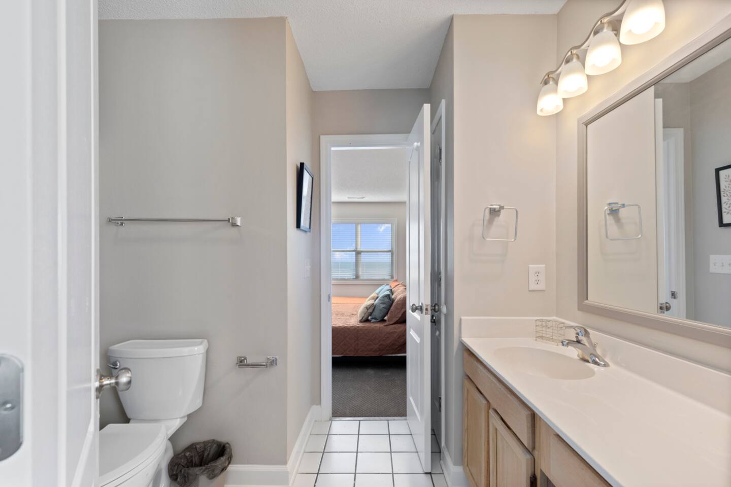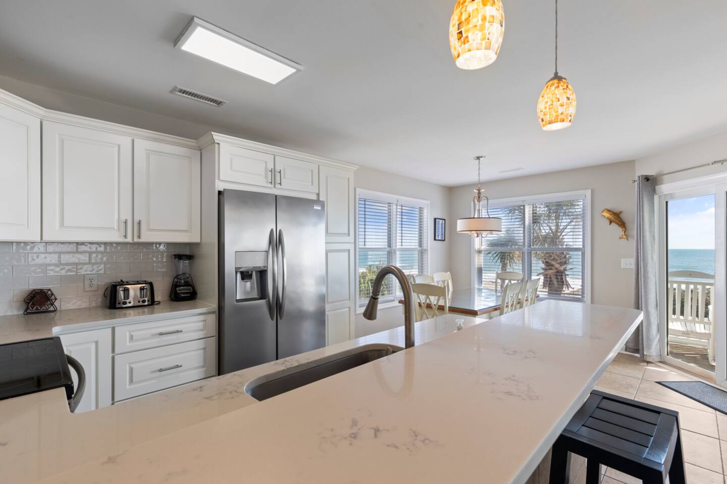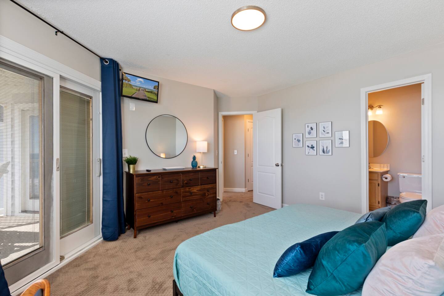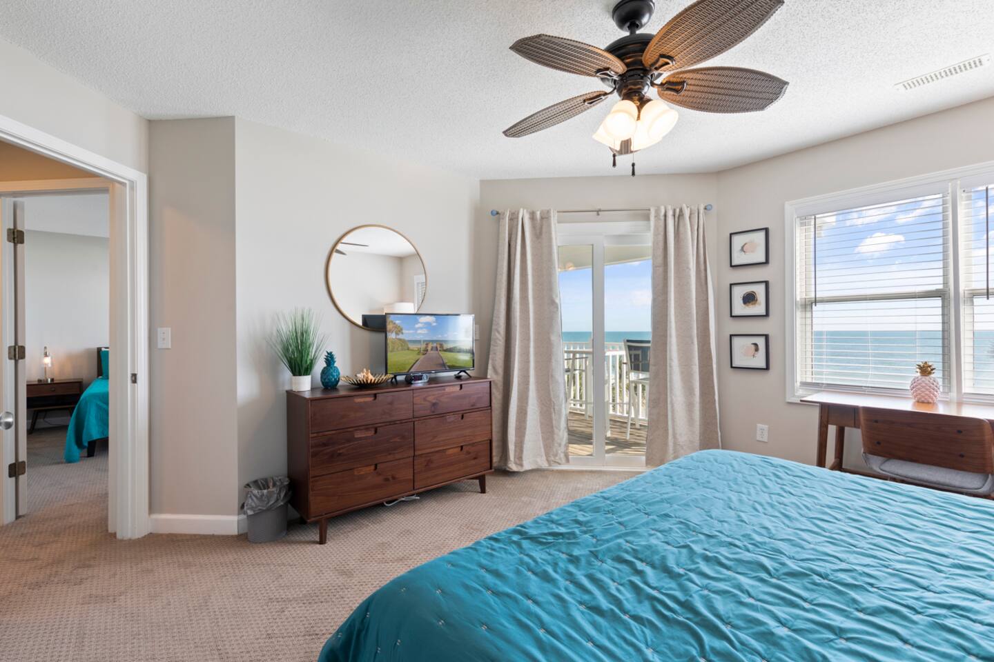 You’ll arrive at Siren's Song and Mermaid's Delight to find the large open covered bonus spaces with picnic table and bench for hanging out on those hot summer days. Under the stairs leading to the front door you will find a treasure trove of beach toys and chairs to enjoy during your stay. In each home as you ease through the electronic keypad accessed front doors you will first find the main level bedroom on your left, which boasts 2 twin over full bunkbeds, then on your right you will find the main level full bathroom as you make your way to the open kitchen, dining, and living room. From the open common area you can go through one of two large sliding glass doors that invite you to relax on the first level deck. You can easily walk through the gate on the main level deck, down the stairs to find yourself with two great options: jump in the pool or walk onto the beach (can’t go wrong!). Back inside the houses, head upstairs to the second level to find the back bedroom with a twin over full bunk bed and a twin over twin bunk bed attached to a Jack-and-Jill full bathroom shared with the 2nd master bedroom. Down the hall you will pass the washer/dryer laundry closet as you arrive at the 2nd master bedroom. Enjoy full ocean views from the 2nd master bedroom while you relax in the king size bed or twin daybed, or open the large sliding glass door to spend some time on the second level deck watching for your mermaid friends! Across the hall is the master bedroom with private full en suite bathroom. The master bedroom includes a luxurious king size bed, work space, and large sliding glass door to the second level balcony.