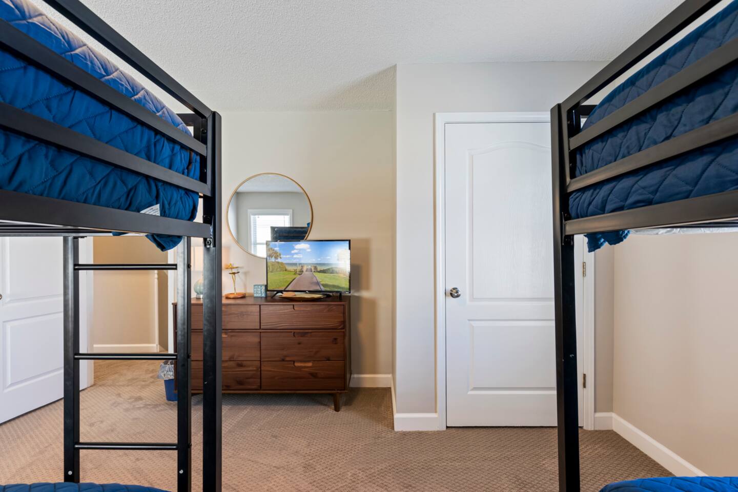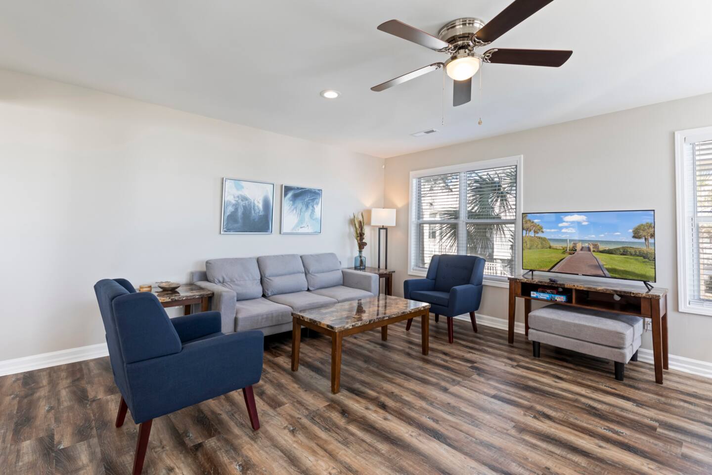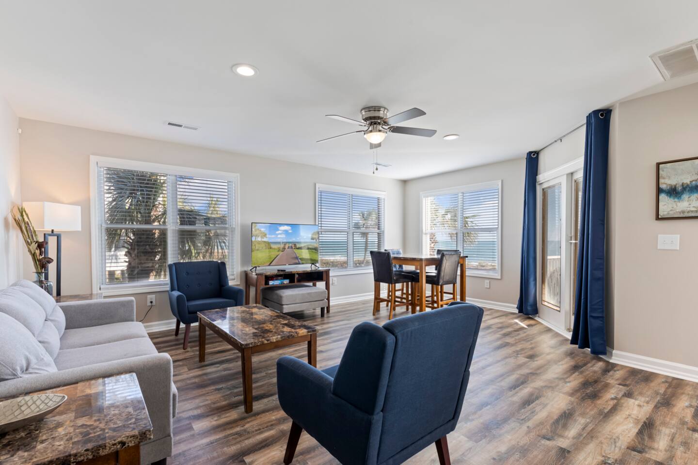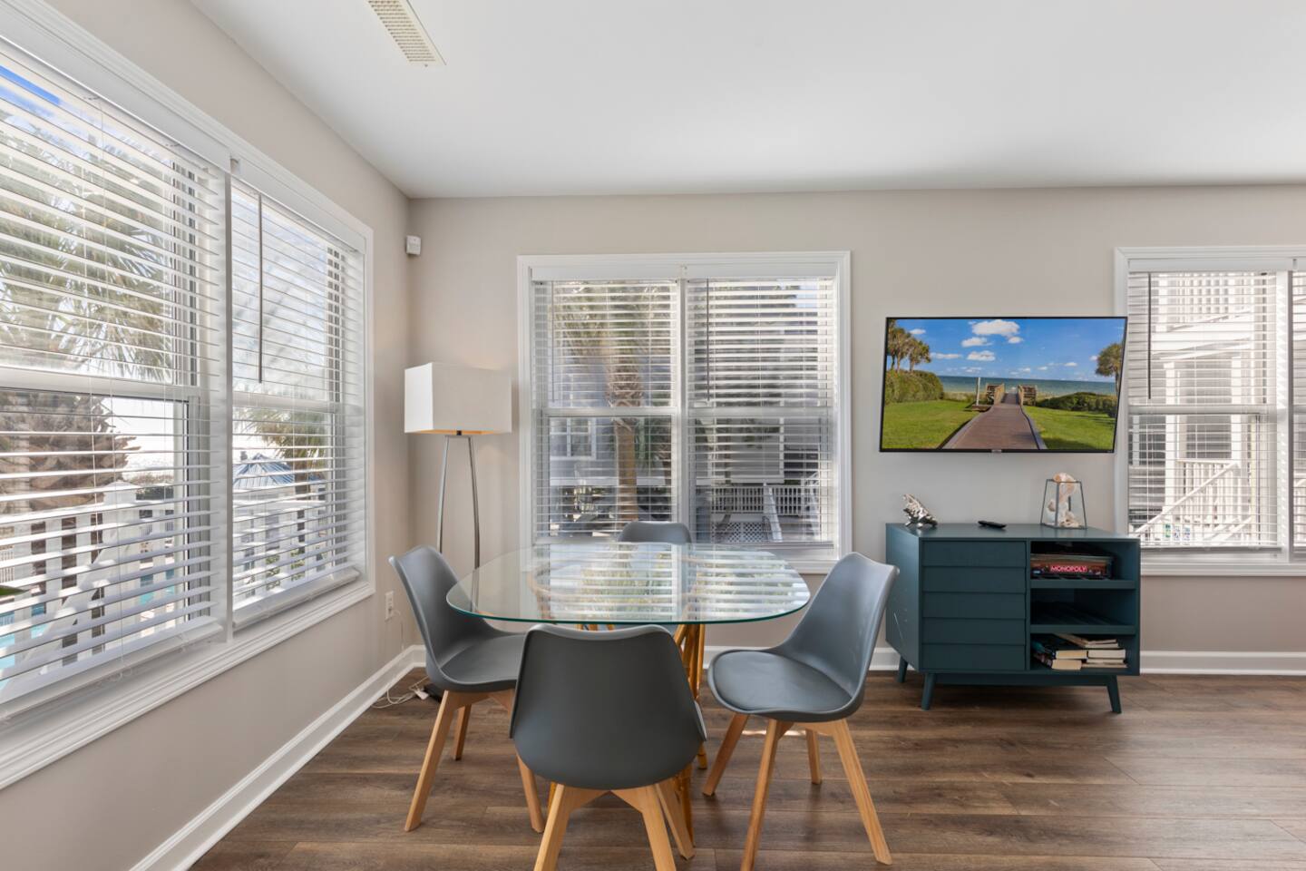 You’ll arrive at Siren's Song and Mermaid's Delight to find the large open covered bonus spaces with picnic table and bench for hanging out on those hot summer days. Under the stairs leading to the front door you will find a treasure trove of beach toys and chairs to enjoy during your stay. In each home as you ease through the electronic keypad accessed front doors you will first find the main level bedroom on your left, which boasts 2 twin over full bunkbeds, then on your right you will find the main level full bathroom as you make your way to the open kitchen, dining, and living room. From the open common area you can go through one of two large sliding glass doors that invite you to relax on the first level deck. You can easily walk through the gate on the main level deck, down the stairs to find yourself with two great options: jump in the pool or walk onto the beach (can’t go wrong!). Back inside the houses, head upstairs to the second level to find the back bedroom with a twin over full bunk bed and a twin over twin bunk bed attached to a Jack-and-Jill full bathroom shared with the 2nd master bedroom. Down the hall you will pass the washer/dryer laundry closet as you arrive at the 2nd master bedroom. Enjoy full ocean views from the 2nd master bedroom while you relax in the king size bed or twin daybed, or open the large sliding glass door to spend some time on the second level deck watching for your mermaid friends! Across the hall is the master bedroom with private full en suite bathroom. The master bedroom includes a luxurious king size bed, work space, and large sliding glass door to the second level balcony.