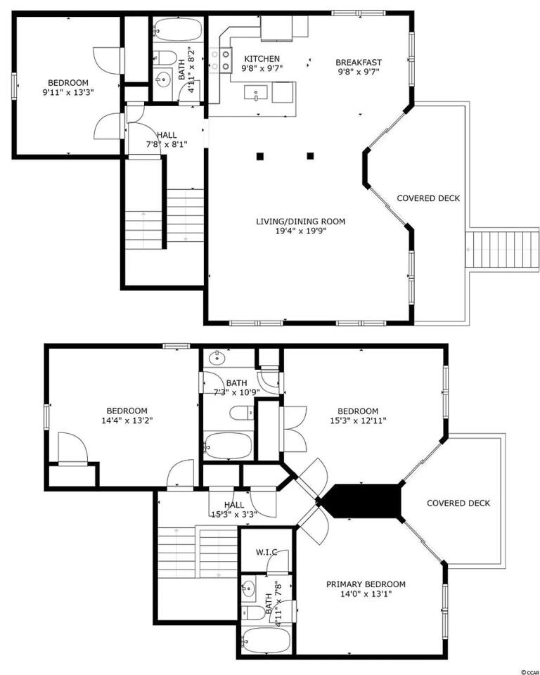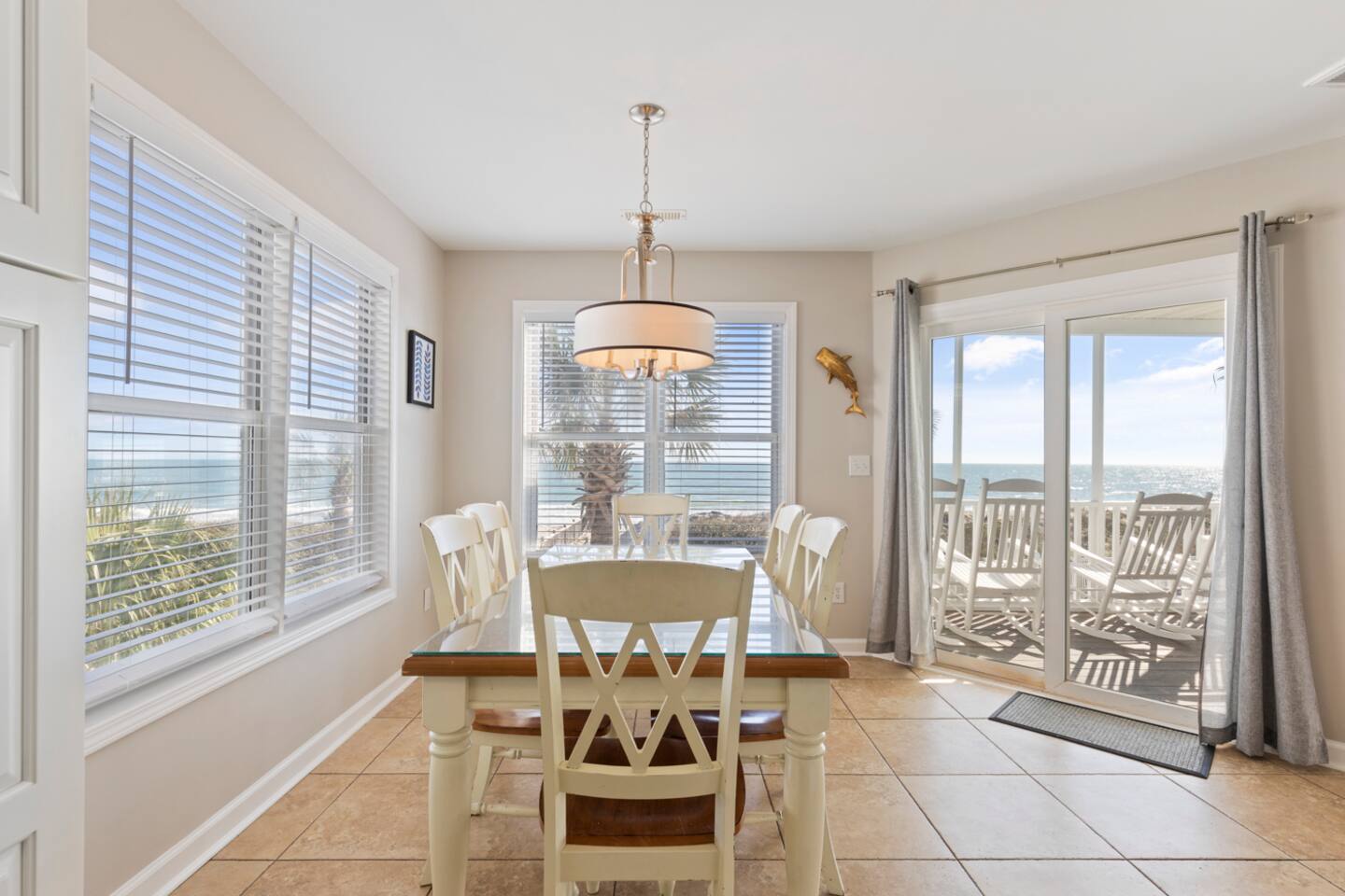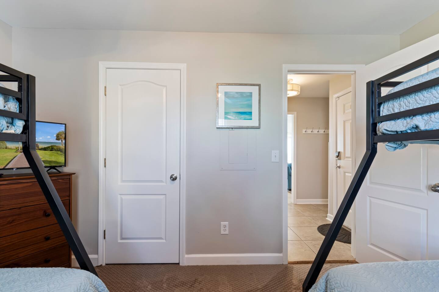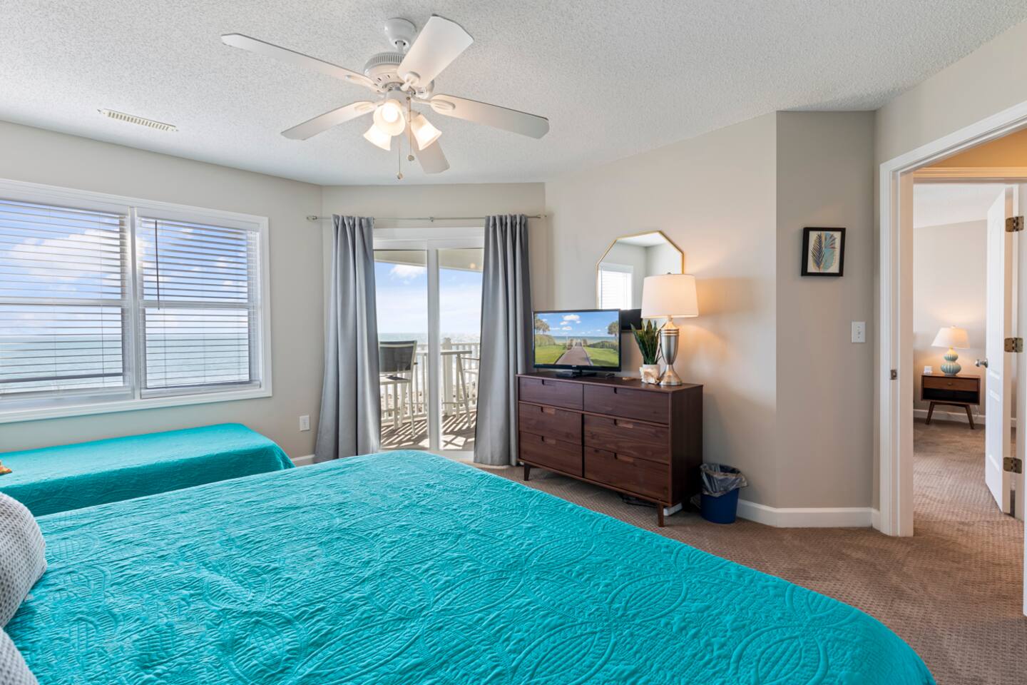 You'll arrive at Mermaid's Delight to find a large open covered bonus space with picnic table and bench for hanging out on those hot summer days. Under the stairs leading to the front door you will find a treasure trove of beach toys and chairs to enjoy during your stay. As you ease through the electronic keypad accessed front door you will first find the main level bedroom on your left, which boasts 2 twin over full bunkbeds, then on your right you will find the main level full bathroom as you make your way to the open kitchen, dining, and living room. From the open common area you can go through one of two large sliding glass doors that invite you to relax on the first level deck. You can easily walk through the gate on the main level deck, down the stairs to find yourself with two great options: jump in the pool or walk onto the beach (can't go wrong!). Back inside the house, head upstairs to the second level to find the back bedroom with a twin over full bunk bed and a twin over twin bunk bed attached to a Jack-and-Jill full bathroom shared with the 2nd master bedroom. Down the hall you will pass the washer/dryer laundry closet as you arrive at the 2nd master bedroom. Enjoy full ocean views from the 2nd master bedroom while you relax in the king size bed or twin day bed, or open the large sliding glass door to spend some time on the second level deck watching for your mermaid friends! Across the hall is the master bedroom with private full en suite bathroom. The master bedroom includes a luxurious king size bed, work space, and large sliding glass door to the second level balcony.